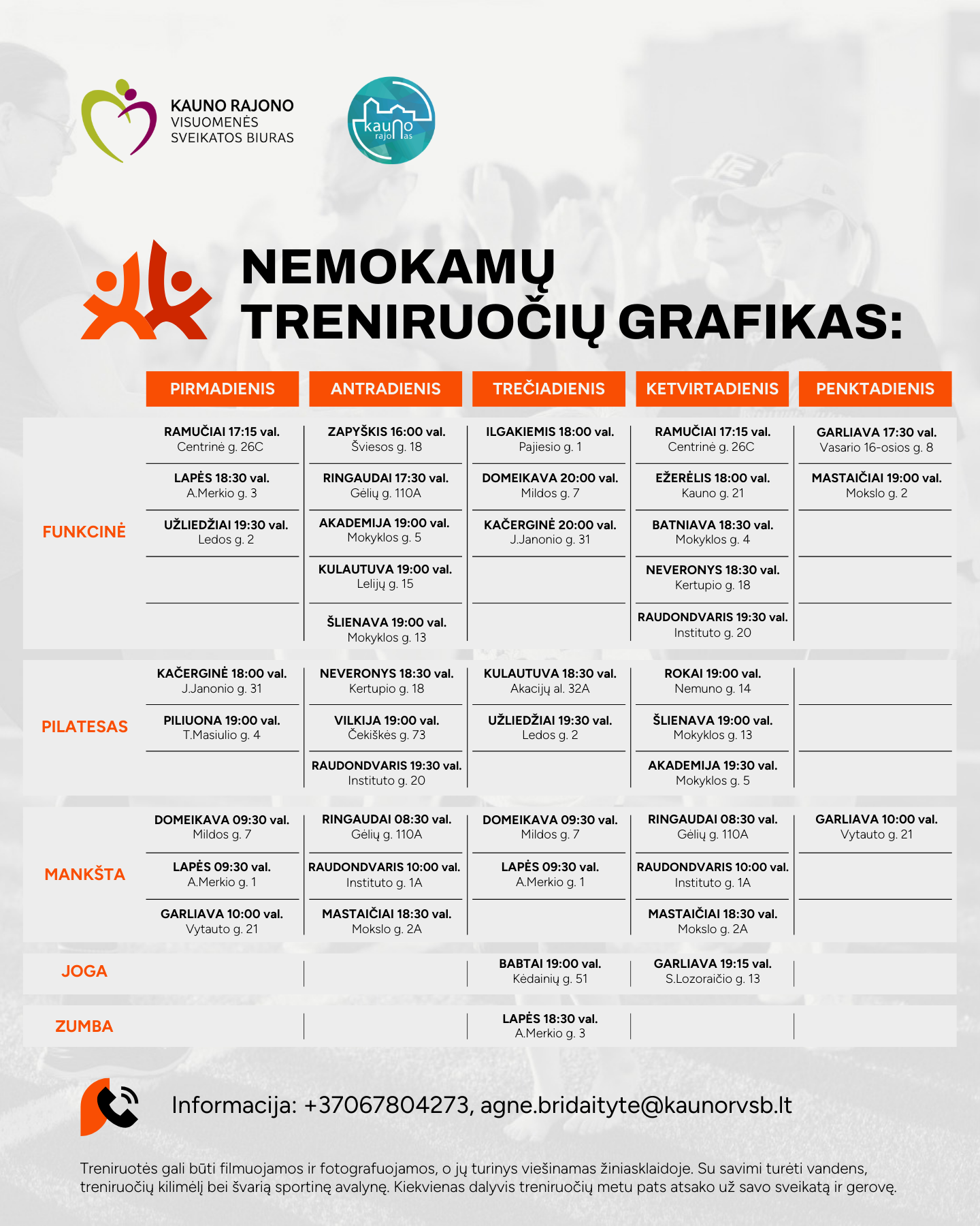 REGISTRACIJA NEBŪTINA, prisijungti prie treniruočių galima bet kuriuo metu. Treniruočių adresai – teksto apačioje ir tvarkaraštyje.